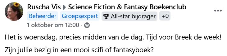 In de rubriek ‘Breek de week’ van Ruscha Vis in de Science Fiction & Fantasy Boekenclub op Facebook heb ik elke woensdag over mijn leeservaringen verteld. Net als de vorige twee kwartalen deel ik onderaan dit artikel een gecureerde versie van die bijdragen. Bekijk ook mijn leesavonturen in het eerste kwartaal en tweede kwartaal van 2025.
